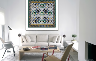 Modelo basado en el zócalo alicatado presente en el Mexuar de la Alhambra de Granada, en España. Esta obra, disponible en tamaños 25x25, 50x50, 75x75 y 100x100 cm es fantástico para decorar y tener una obra de arte de alta calidad en casa o en la oficina que representa toda la esencia de la Alhambra de Granada y, por extensión, de todo el arte que dejó el mundo árabe en la Península Ibérica. Decorado en colores pastel, sobre un fondo blanco. Sin duda es una obra de arte de la que podrás presumir ante cualquier visita que la contemple. La [...]