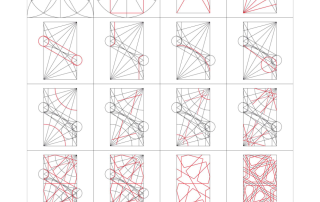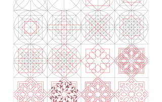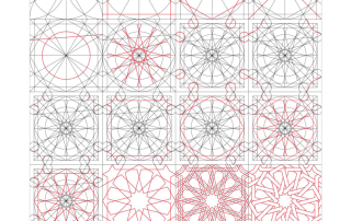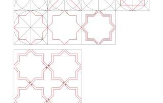 Siria (AD 1574 / AH 982) Este póster explica, paso a paso, el trazado del entrelazo curvilíneo presente en la mezquita Darwish Pasha. A partir de divisiones radiales del círculo y un rectángulo guía, las líneas y arcos (gris) van generando la característica “S” que se multiplica hasta formar una red de cintas enlazadas (rojo). Incluye una miniatura con el patrón final. Muestra con claridad todas las etapas: de la retícula a la malla orgánica definitiva. Motivo poco común dentro de la lacería: strapwork curvo con gran dinamismo visual. Proporciones fieles al método geométrico histórico. Un póster que combina rigor [...]
