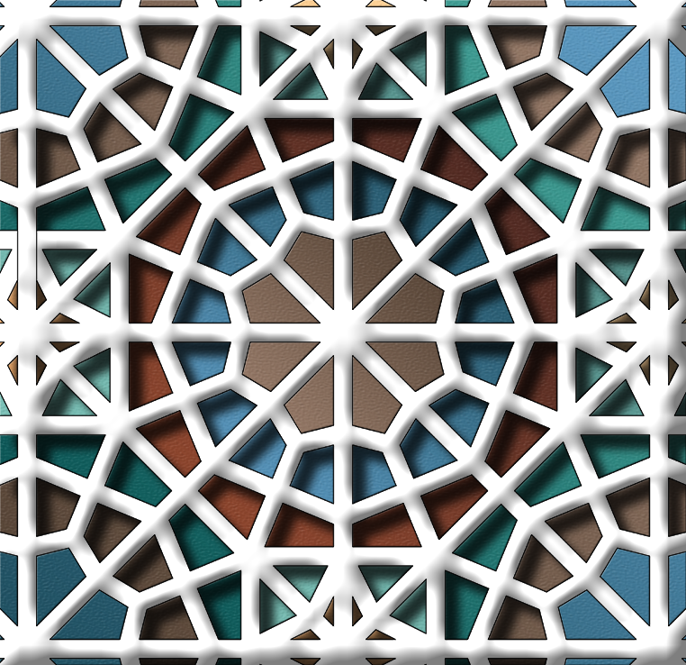Elegancia Estructural: Una red de líneas en blanco puro flota sobre los colores, creando un “strapwork” (entrelazado) que pone orden y luminosidad al conjunto.
