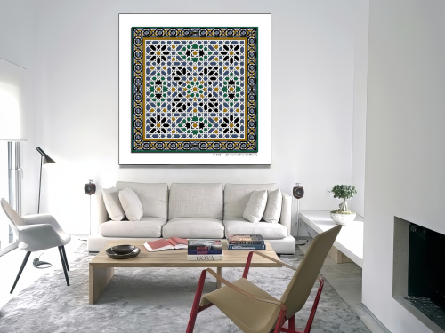 Esta obra, disponible en tamaños 25×25, 50×50, 75×75 y 100×100 cm es fantástico para decorar y tener una obra de arte de alta calidad en casa o en la oficina que representa toda la esencia de la Alhambra de Granada y, por extensión, de todo el arte que dejó el mundo árabe en la Península Ibérica.