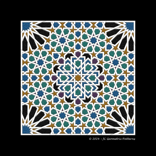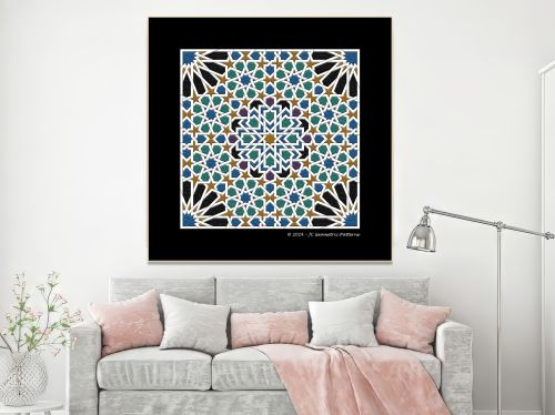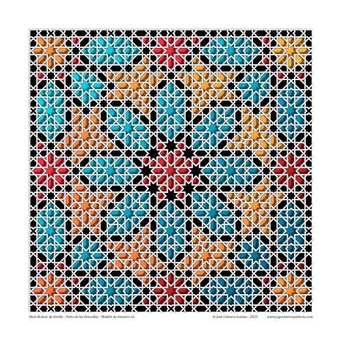 Motivo de lacería inspirado en la yesería del Patio de las Muñecas (Real Alcázar de Sevilla). La red de “flechas/estrellas” se dibuja en cinta blanca con relieve y sombra, sobre un fondo en degradados coral–pizarra–turquesa que aporta profundidad y un carácter actual sin perder la esencia histórica.