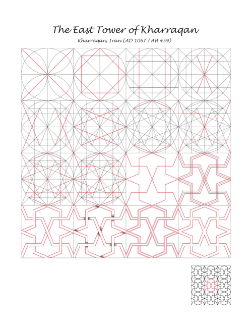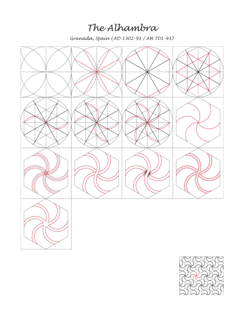 Este póster descompone, paso a paso, el trazado de un motivo histórico de la Necrópolis de Chella. Las líneas guía en gris muestran la retícula de círculos, diagonales y cuadrados; el dibujo activo en rojo construye las estrellas y la lacería magrebí hasta la versión final. Incluye miniaturas con varias variantes de teselación para apreciar diferentes ritmos del patrón.