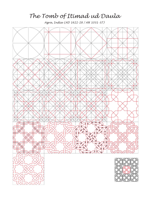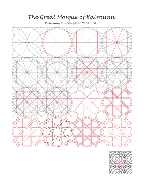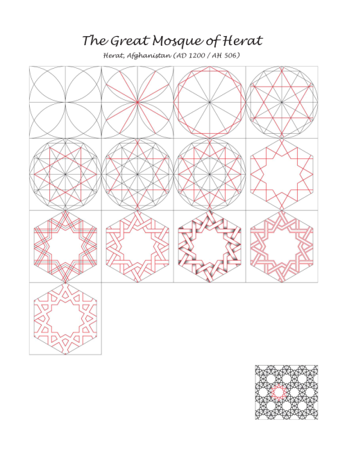 Este póster desvela, paso a paso, el trazado de un motivo de la mezquita Esrefoglu. A partir del círculo se construye el octógono regular y, sobre él, la estrella y la lacería características del arte selyúcida. Las líneas guía en gris muestran la retícula y las divisiones; el dibujo activo en rojo desarrolla las bandas entrelazadas hasta la teselación final (miniatura incluida).