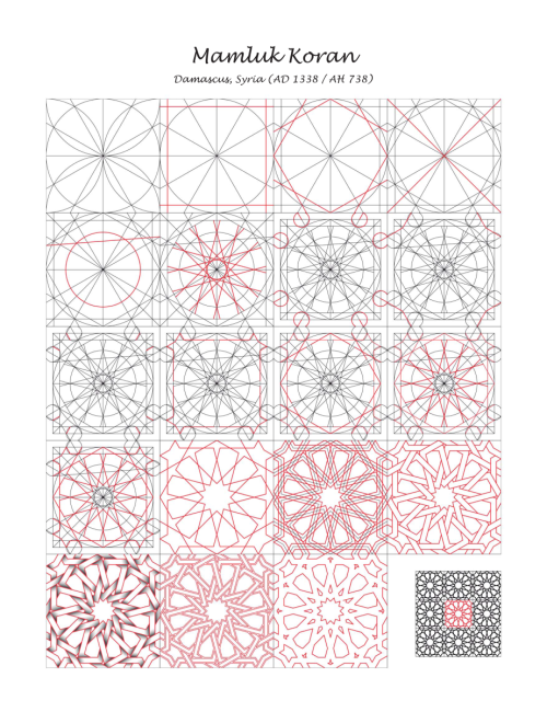 Muestra con claridad todas las etapas: de la retícula al entramado completo. Ritmo estelar y cintas entrelazadas con fuerte presencia gráfica. Proporciones fieles al método geométrico histórico de la tradición iraquí.