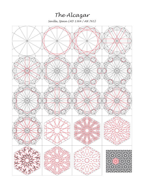 Este póster desvela, paso a paso, el trazado de un motivo histórico de la Madraza Mustansiriya. Desde el círculo y sus divisiones radiales se construyen la estrella central y la lacería angular característica hasta el patrón definitivo. Las líneas guía aparecen en gris y el dibujo activo en rojo. Incluye una miniatura con la teselación final.