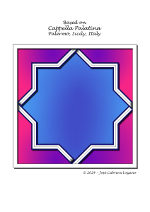 Diseño inspirado en la Cappella Palatina: una estrella de ocho puntas rotunda y precisa sobre un degradado azul eléctrico en contraste con magenta/fucsia. Las aristas perfiladas y el leve relieve realzan la limpieza del trazo y la convierten en un acento cromático elegante.