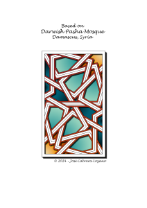 Patrón tomado de la mezquita Darwish Pasha. Una malla de cintas entrelazadas genera ritmos diagonales en turquesas y verdes con acentos ámbar y perfiles blancos. El formato vertical y el juego de profundidad le dan un carácter dinámico que encaja de maravilla en muros estrechos o composiciones en columna.