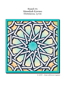 Un motivo tomado de un corán mameluco: una roseta estrellada en trama entrelazada que irradia desde el centro sobre un fondo de verdes aguamarina, crema y albaricoque. El fileteado blanco con sombra sutil aporta volumen, mientras el bisel turquesa enmarca el conjunto con frescura.