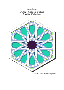Una roseta expansiva inspirada en la mezquita de Thatta: cintas entrelazadas en blanco y lavanda forman un motivo estelar que se abre sobre un fondo de turquesas y verdes aguamarina, con un corazón púrpura que aporta profundidad. El perímetro hexagonal y las sombras suaves realzan el volumen y la limpieza del trazo.