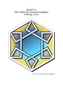 Una composición luminosa inspirada en el complejo de Natanz. Cuatro módulos angulares se entrelazan mediante cintas blancas con filete azul, girando alrededor de un interior azul–turquesa que hace de ventana al centro. El degradado hacia ocres y dorados en el perímetro y las sombras suaves aportan volumen y ritmo al trazado.