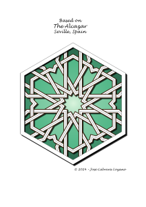 Un entramado de cintas blanco-marfil se cruza con precisión sobre un fondo verde jade en degradado, generando una estrella central que parece palpitar. La pieza toma como referencia los motivos del Real Alcázar de Sevilla y los traduce a un lenguaje contemporáneo con sombras sutiles y un formato hexagonal muy limpio.