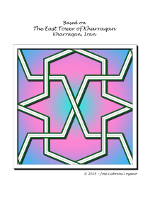 Un entramado de bandas entrelazadas en verde con filete blanco dibuja quiebros y simetrías en torno a una estrella central. El fondo en degradados rosa-malva y azul turquesa aporta profundidad y un aire contemporáneo a un motivo inspirado en la ornamentación selchúcida de la torre oriental de Kharraqan.