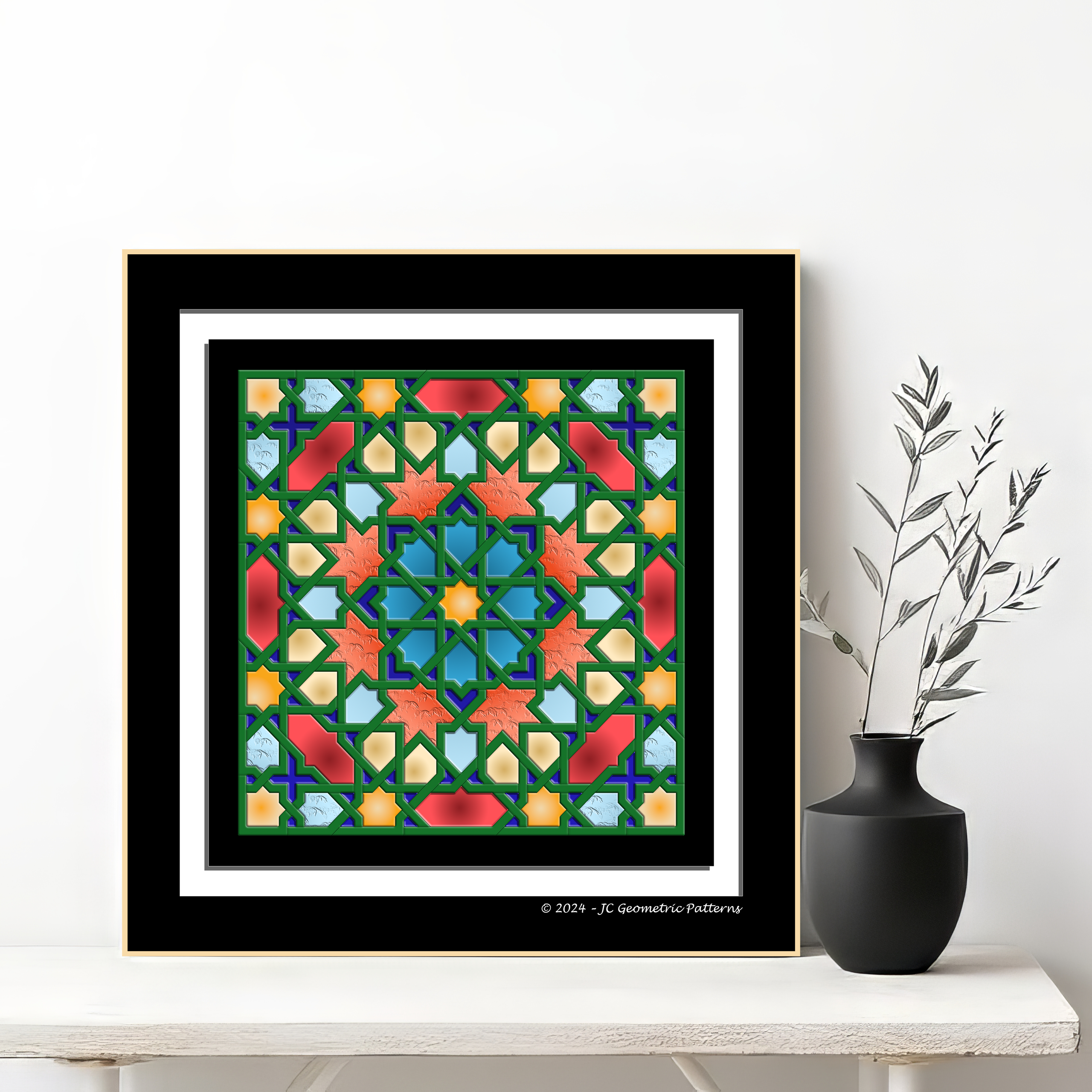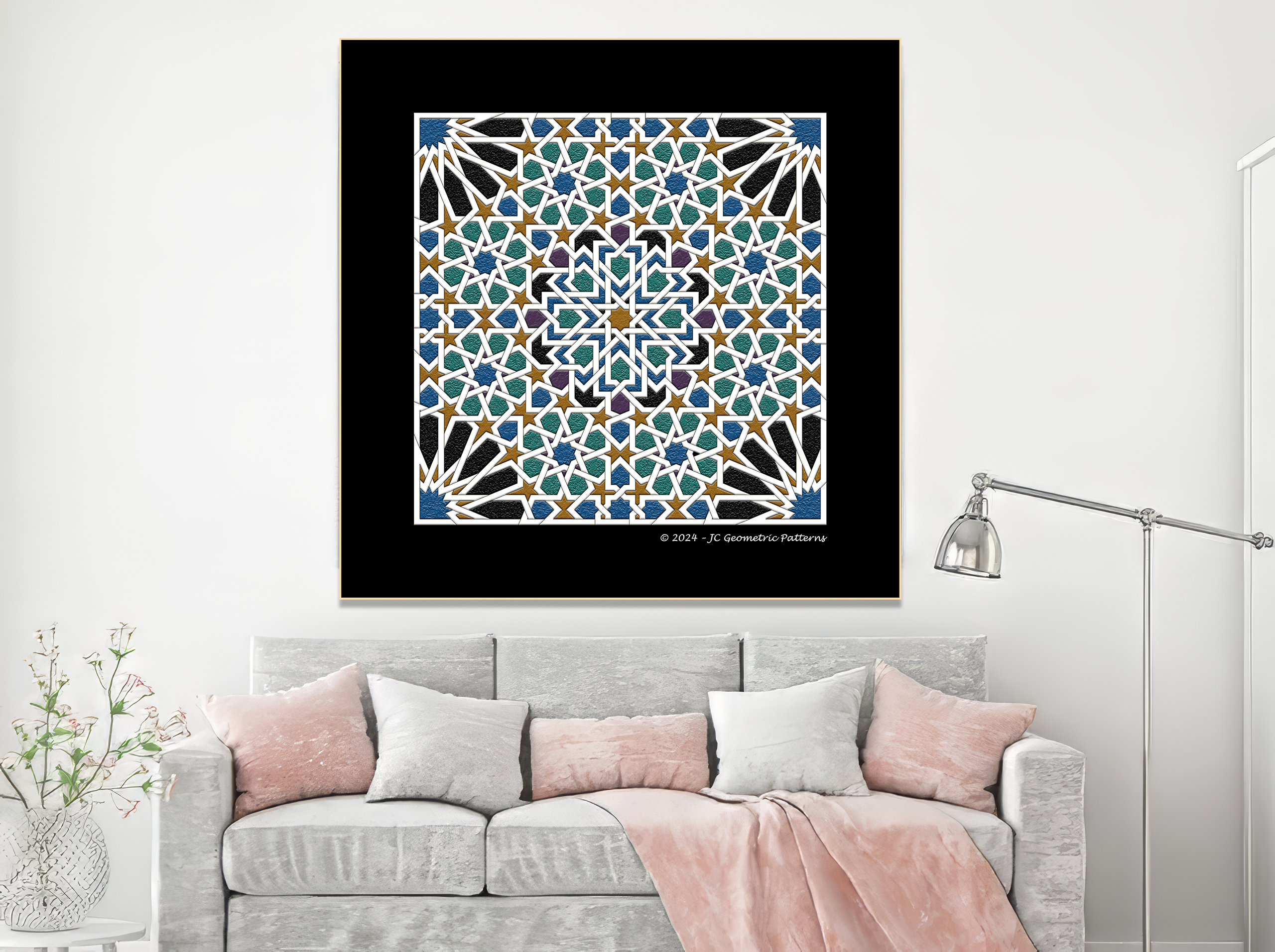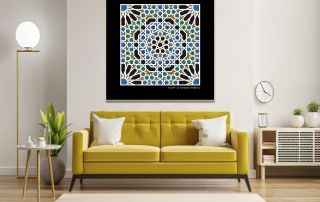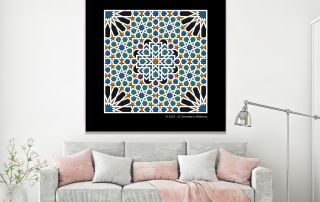 Modelo basado en el zócalo alicatado presente en el Mexuar de la Alhambra de Granada, en España. Esta obra, disponible en tamaños 25x25, 50x50, 75x75 y 100x100 cm es fantástico para decorar y tener una obra de arte de alta calidad en casa o en la oficina que representa toda la esencia de la Alhambra de Granada y, por extensión, de todo el arte que dejó el mundo árabe en la Península Ibérica. Decorado en colores pastel, sobre un fondo blanco. Sin duda es una obra de arte de la que podrás presumir ante cualquier visita que la contemple. La [...]