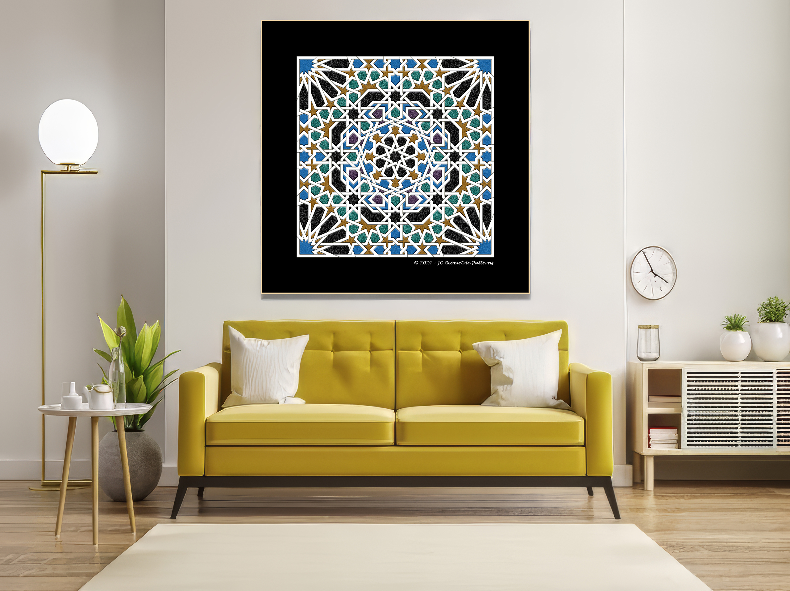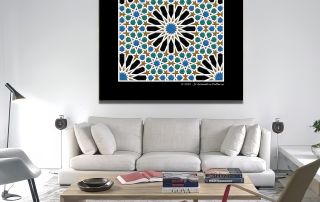 Modelo basado en el zócalo alicatado presente en el Mexuar de la Alhambra de Granada, en España. Esta obra, disponible en tamaños 25x25, 50x50, 75x75 y 100x100 cm es fantástico para decorar y tener una obra de arte de alta calidad en casa o en la oficina que representa toda la esencia de la Alhambra de Granada y, por extensión, de todo el arte que dejó el mundo árabe en la Península Ibérica. Decorado en colores similares a los originales, sobre un fondo negro. Sin duda es una obra de arte de la que podrás presumir ante cualquier visita que [...]