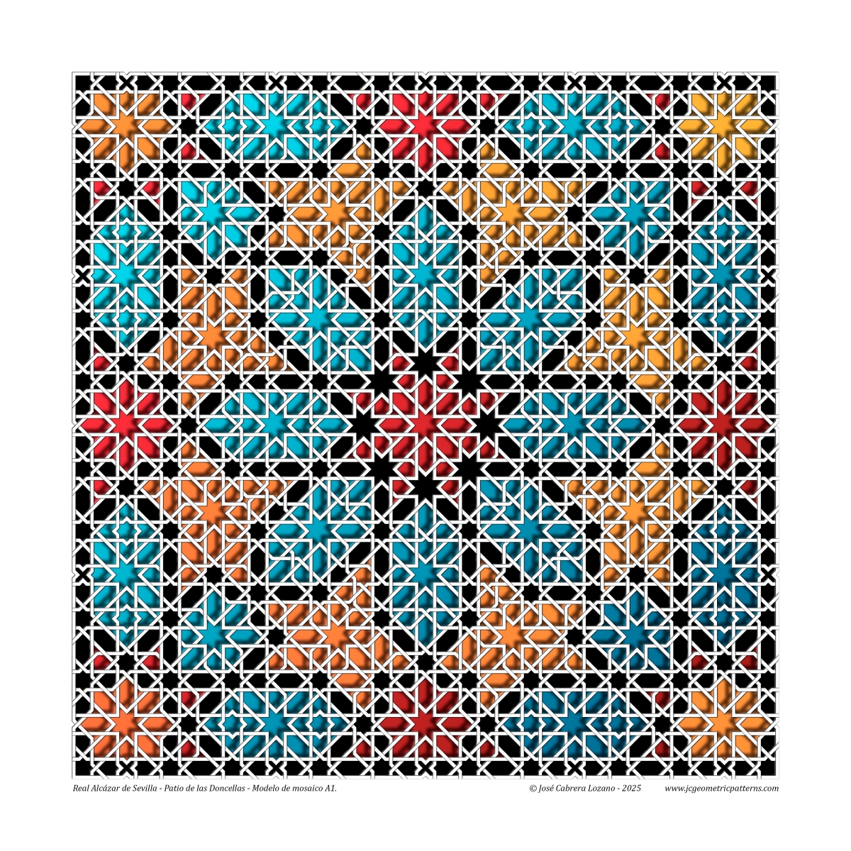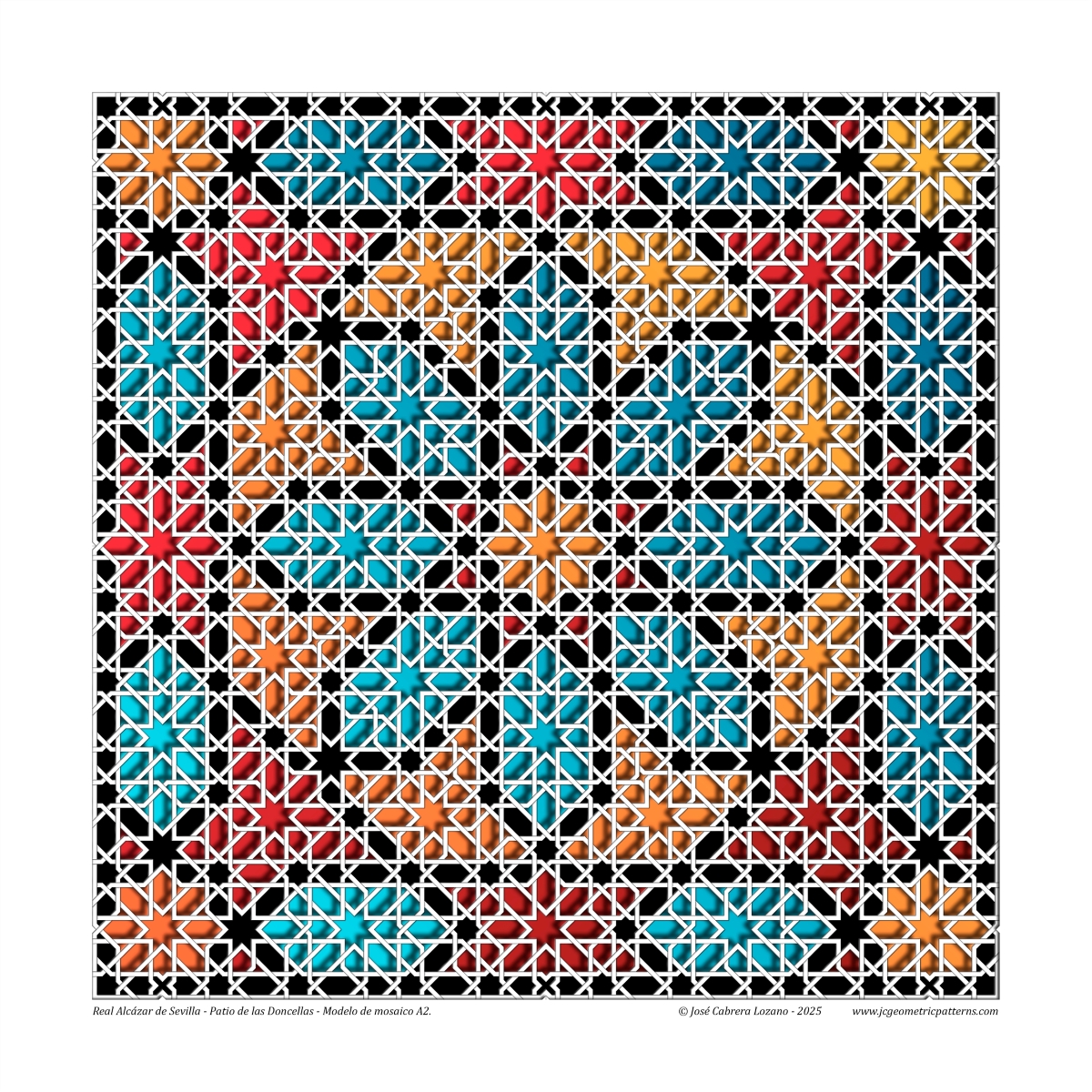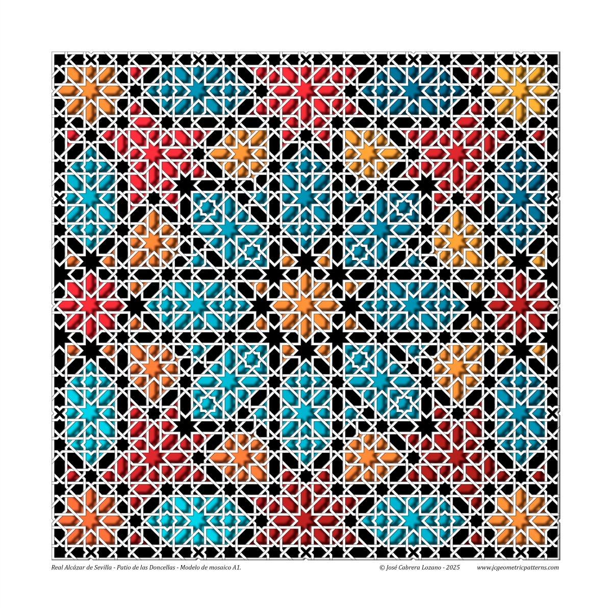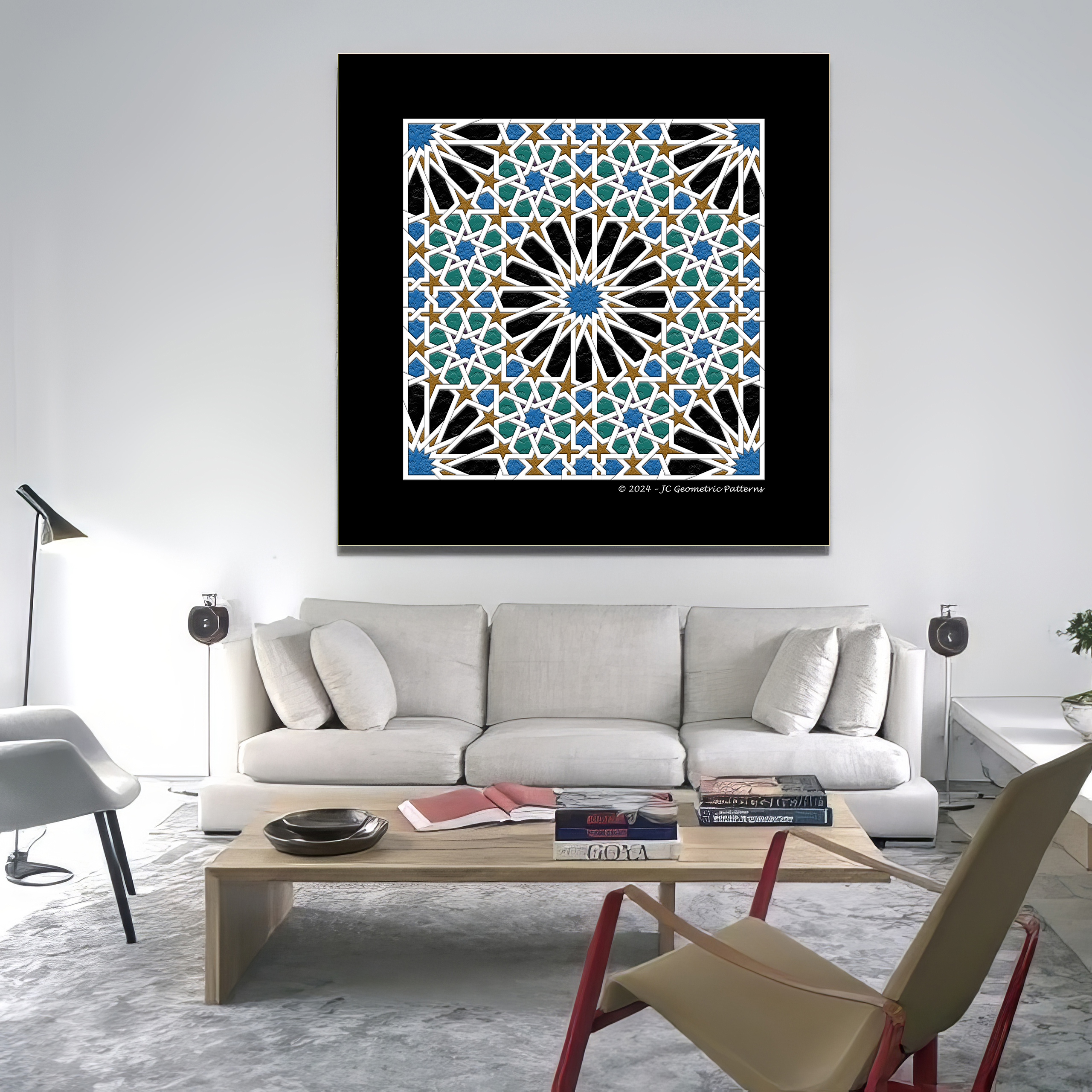 Inspirada en los alicatados del Patio de las Doncellas (Real Alcázar de Sevilla), esta pieza despliega una constelación de estrellas entrelazadas y lacería mudéjar sobre fondo negro. La paleta —turquesas, rojos, ocres y toques dorados— reinterpreta la policromía histórica, mientras el trazado blanco aporta luz y un sutil efecto de relieve. Geometría precisa con ritmo ornamental y gran profundidad visual. Colores armonizados que evocan la cerámica sevillana clásica. Estética atemporal: encaja tanto en interiores modernos como en espacios patrimoniales. La obra se entrega con con los márgenes que se pueden ver en la imagen. Las medidas indicadas incluyen este margen. [...]