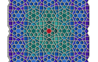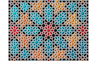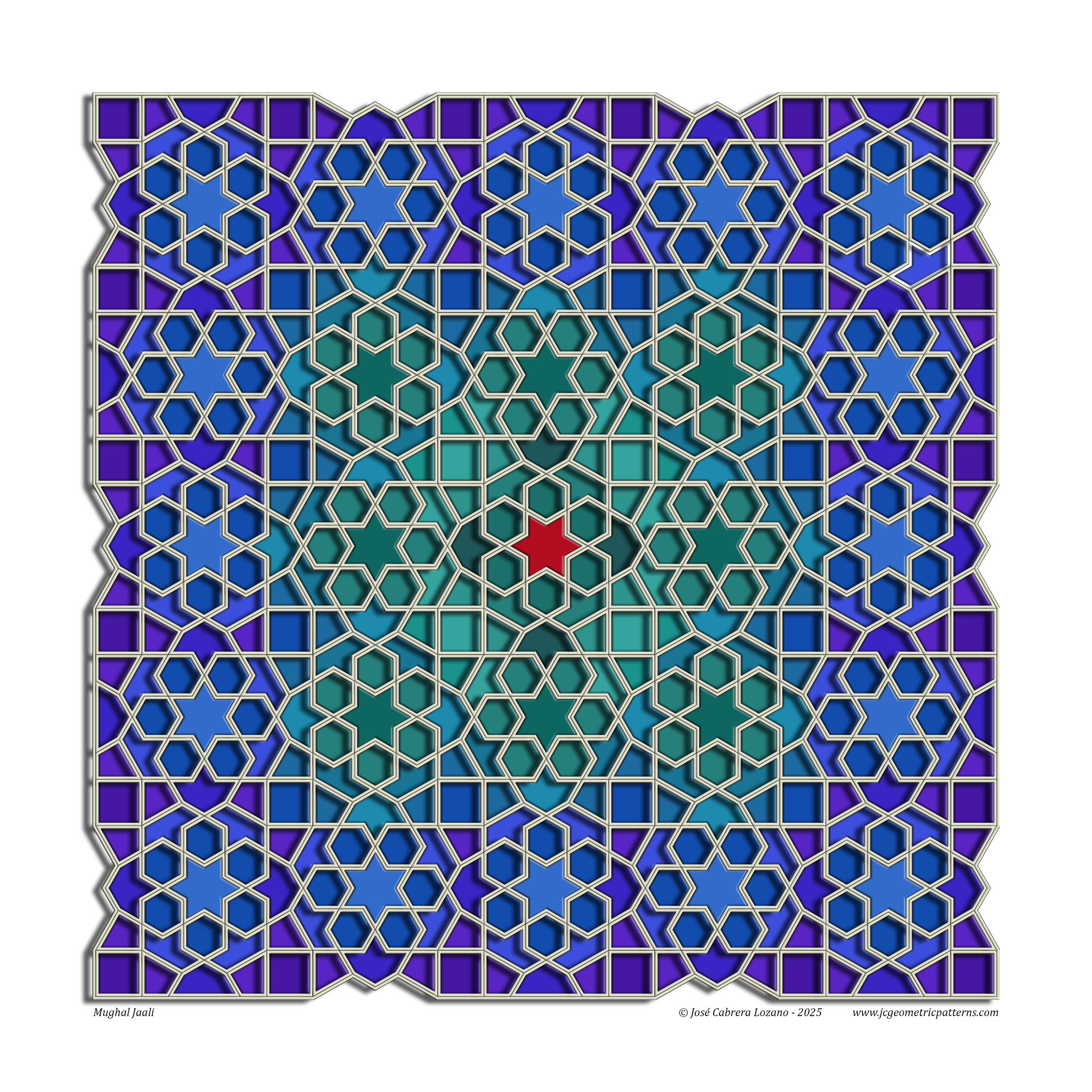 Una celosía mogola reinterpretada: una malla de estrellas de 6 y 8 puntas que se expande en azules y turquesas, rematada por un centro rojo que ancla la mirada. El [...]