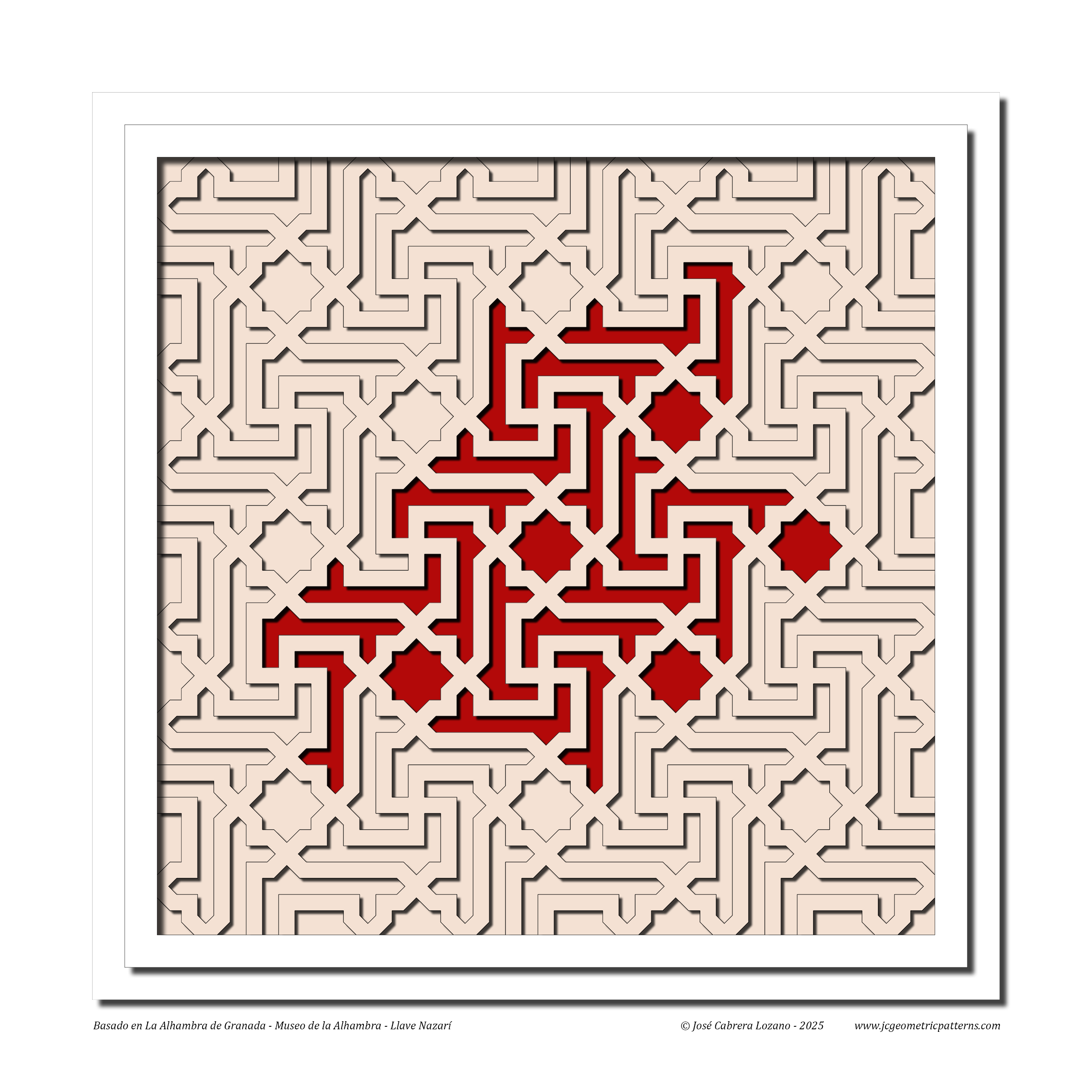Una interpretación contemporánea de un motivo del Museo de la Alhambra. La “llave” central, marcada en rojo, vertebra una trama de estrellas y cruces que queda deliberadamente sin completar: el dibujo se interrumpe, como si el artesano se hubiera detenido un instante, invitando a la mirada a terminarlo mentalmente. El relieve y las sombras evocan el yeso tallado nazarí con un acabado limpio y actual. Elige tu obra Formato: cuadrado Tamaños (cm): 25×25, 50×50, 75×75, 100×100 Papeles fine art: Acuarela 240 g/m² (textura natural y tonos suaves) Hahnemühle William Turner 310 g/m² (algodón, grano marcado y presencia museística) Impresión: Giclée [...]